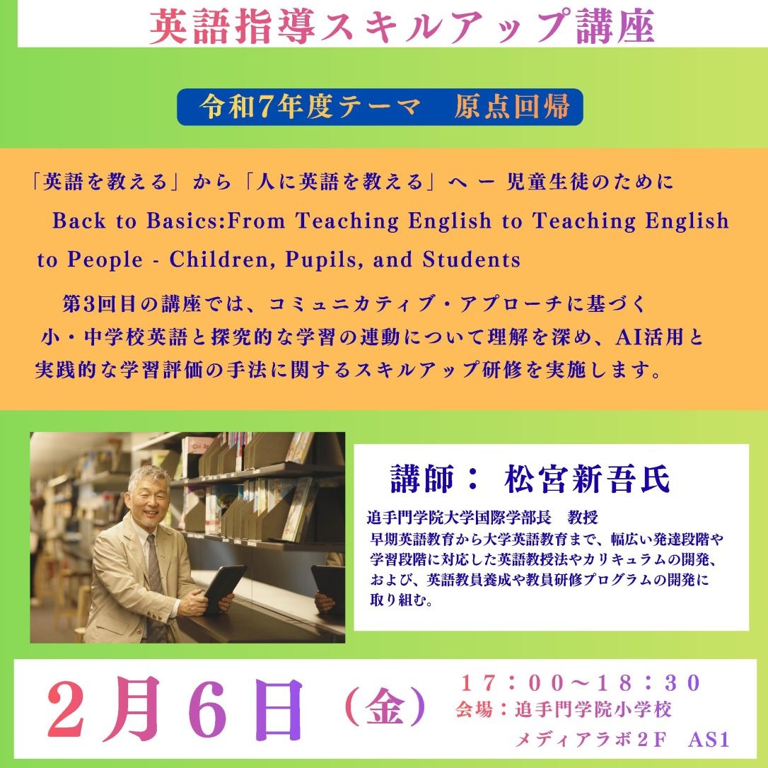 第3回目の講座では、コミュニカティブ・アプローチに基づく小・中学校英語と探究的な学習の連動について理解を深め、AI活用と実践的な学習評価の手法に関するスキルアップ研修を実施します。